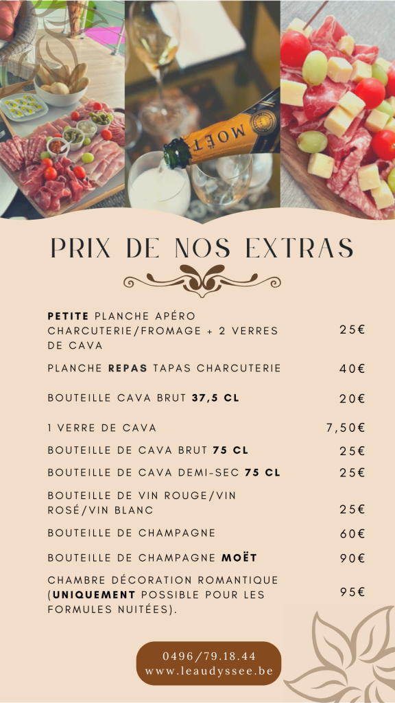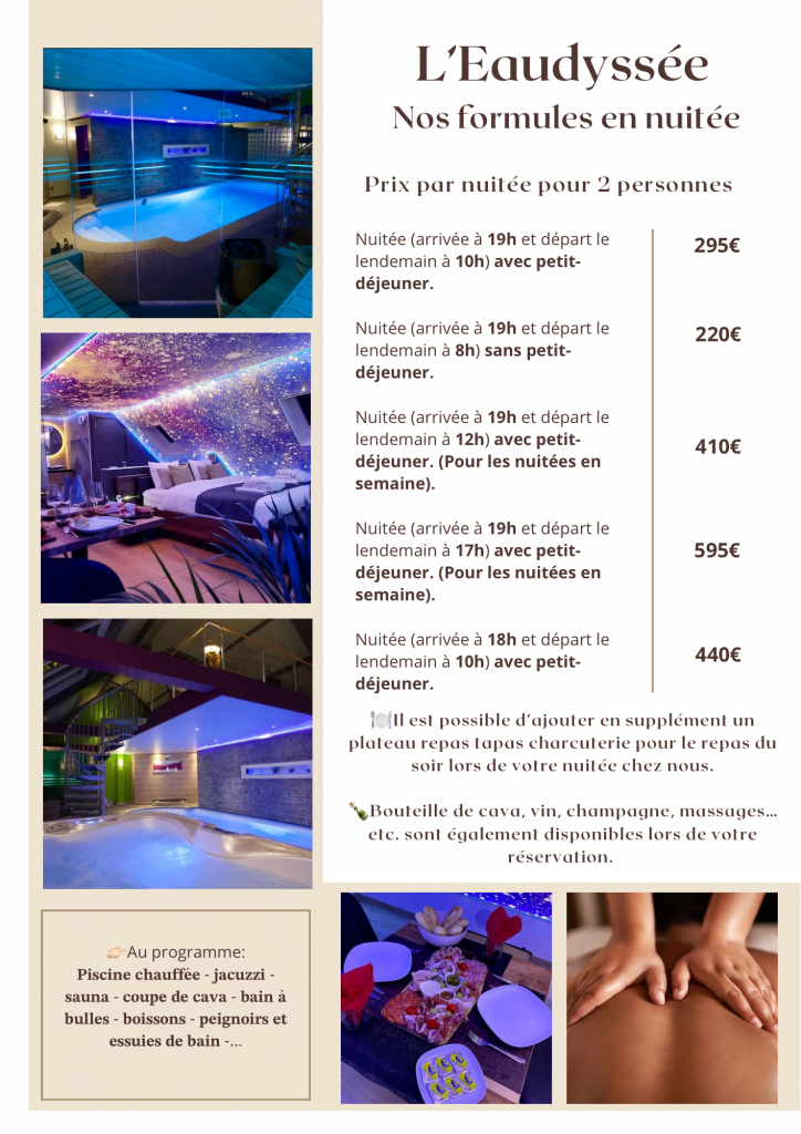 Tarifs pour une nuit dans notre suite l'Eaudyssée avec accès illimité au centre Wellness privatif (voir équipement et explications de la suite dans l'onglet "Notre Suite").