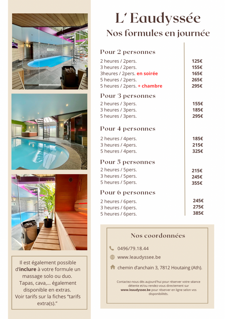 Voici nos différentes formules pour la location du centre Wellness privatif durant la journée: